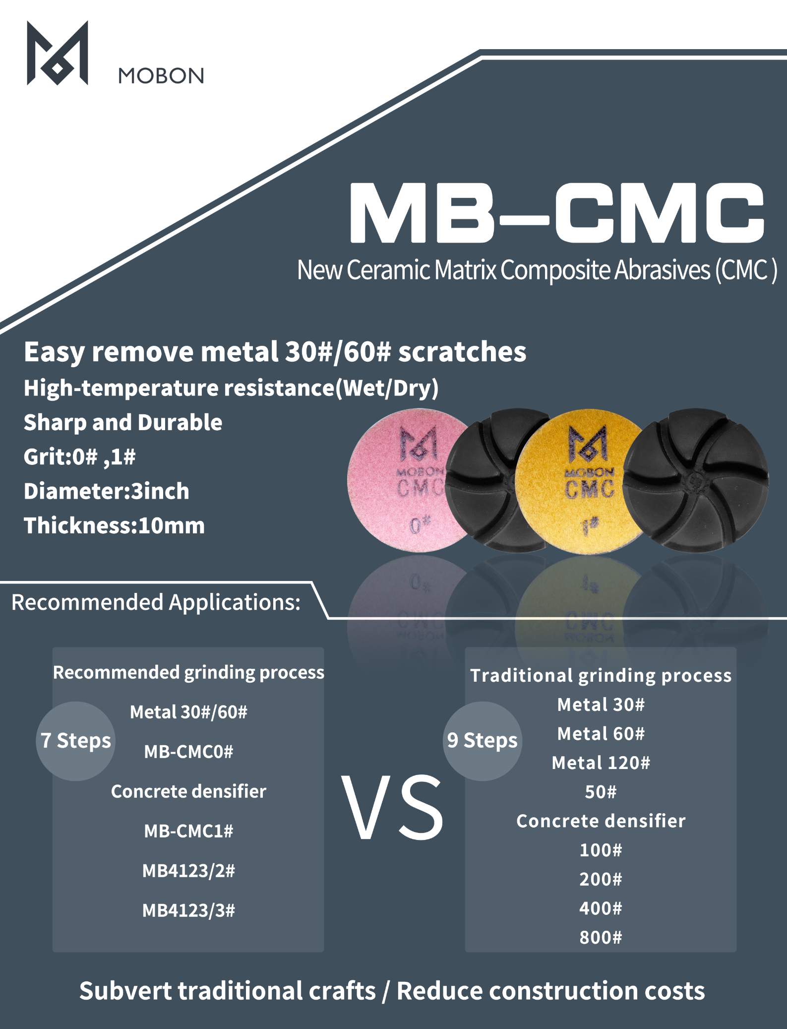 2. High temperature resistance, suitable for the whole process of dry grinding on the floor, without burning chips and corroding the ground;