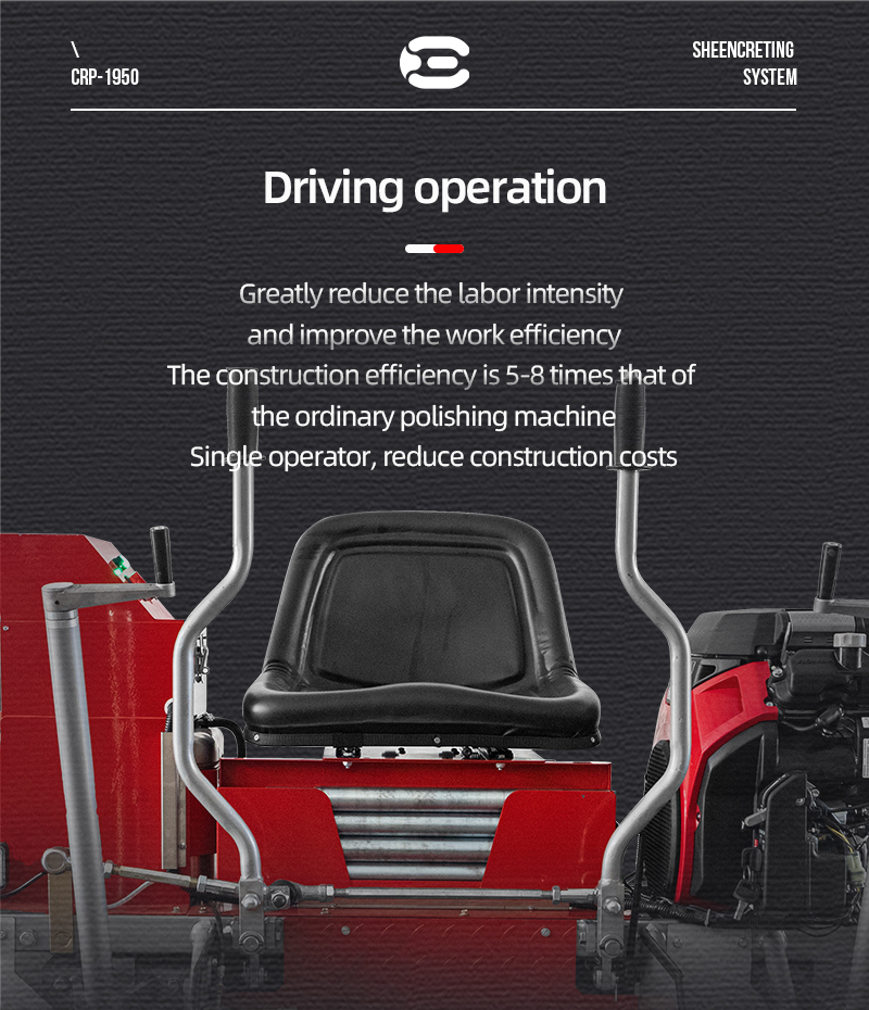 The Conglory CRP-1950 and CRP-1580 ride-on power trowel machine can be used for polishing with Sheencreteing system kits, with high polishing productivity up to 300 to500 square meters per hour.